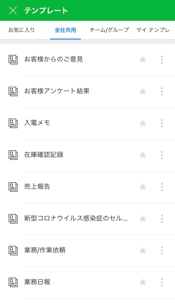 また、「全社共用」には基本提供される8つのテンプレートと社内のメンバーが誰でも使えるテンプレートを追加することができます。