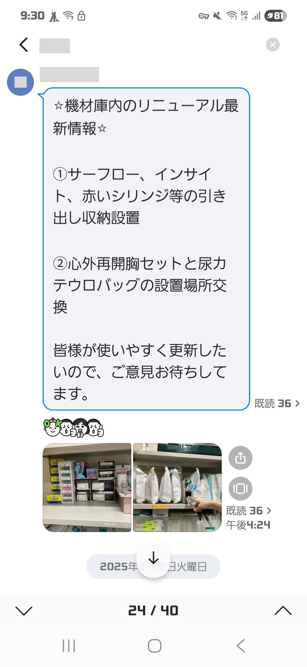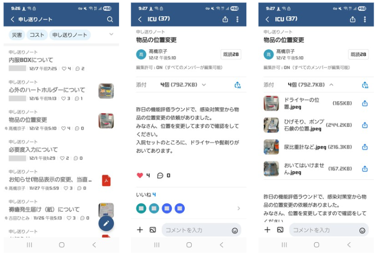 看護師間だけでなく、ナースエイドさんともリアルタイムでのやり取りが可能になりました。ナースエイドさんの業務のひとつに、ICUにあるたくさんの物品の在庫管理や配置調整などをしていただいています。これらについてもナースエイドさんから看護師に向けて発信していただいて、とても助かっています。『○○の置き場が変更になりました』など写真付きでお知らせしてくれます。