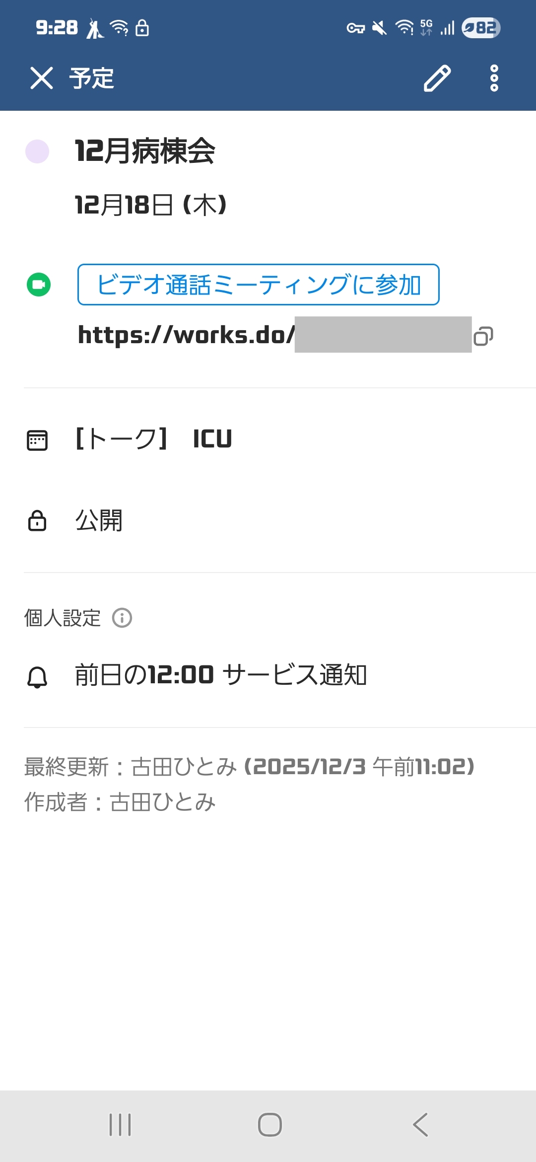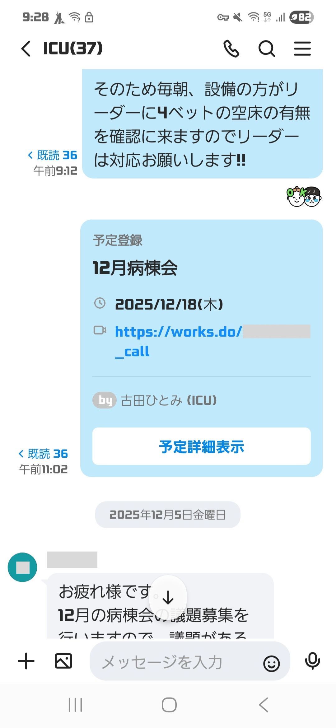 病棟会の日程は年間で決まっていて、例えば「病棟会の日」はカレンダーに登録しており、ビデオ会議用のURL(ミーティングリンク)を発行して、各々が確認できるようにしています。
