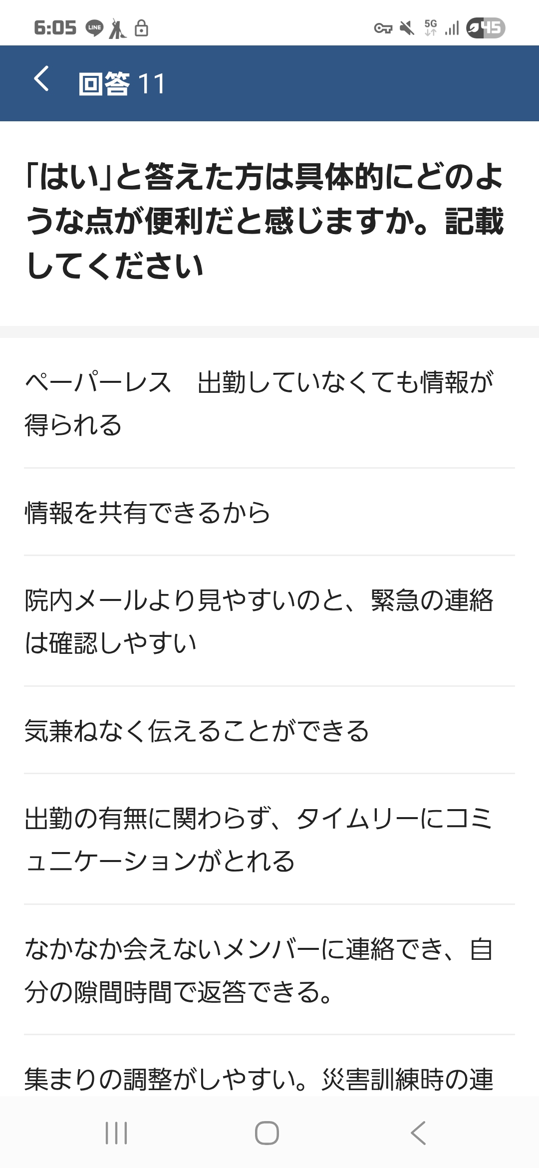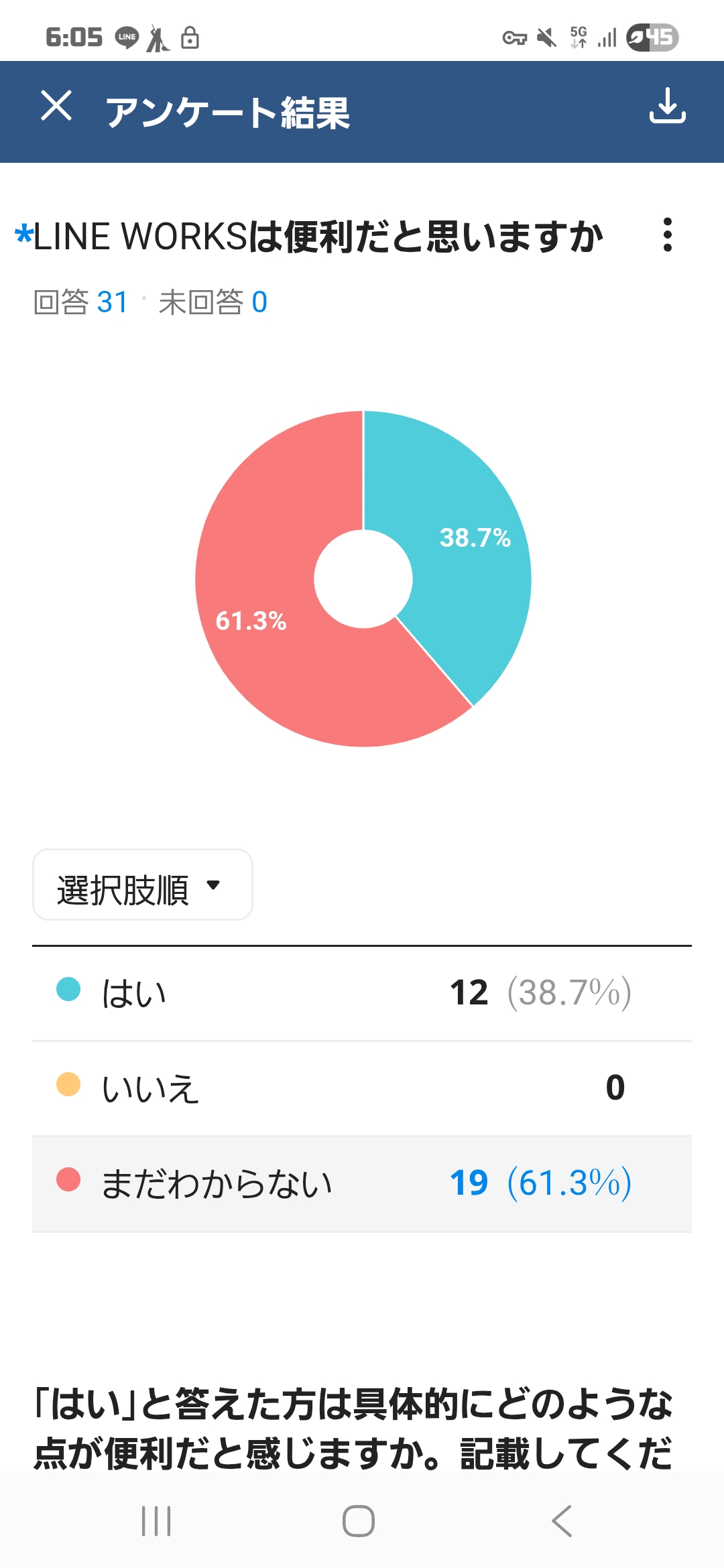 元々別のアンケートフォームを使っていたのですが、LINE WORKSのアンケート機能を使い始めている方もいます。例えば、係活動の内容について「○○をやってみてどうでしたか?」と感想や意見を収集し、アンケート結果をLINE WORKSで共有しています。