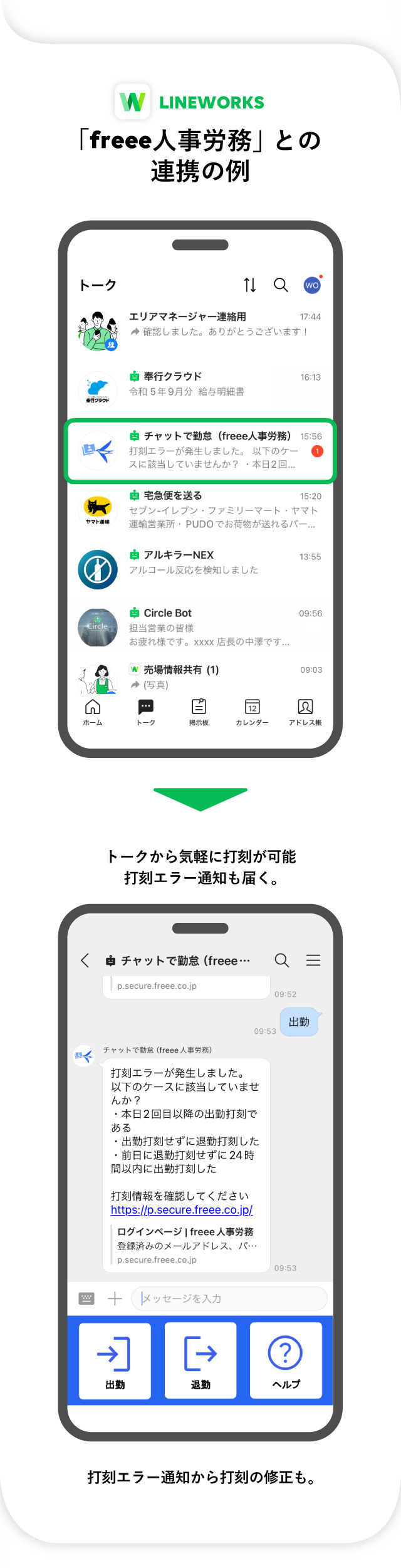 従業員がいちいち勤怠専用サイトに行かなくても「LINE WORKS」上で日々の「出勤」「退勤」の打刻ができる。打刻修正の通知がきた場合も、同じトークルーム上でその場で、修正が完了できます。