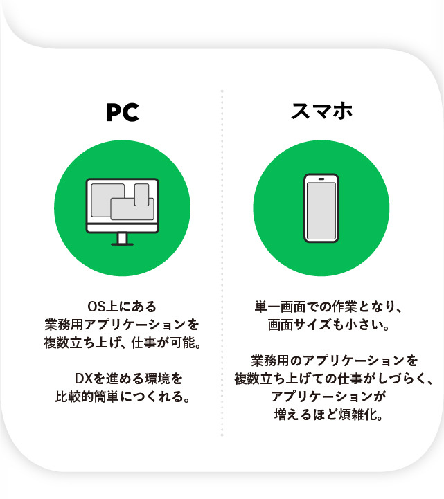 スマホにおいてはコンシューマー向けのサービス開発が先行し、今やスマホファーストが常識になっていますが、ビジネス向けのアプリやシステムはまだまだ“パソコンファースト”を前提にしている場合が多いんです。