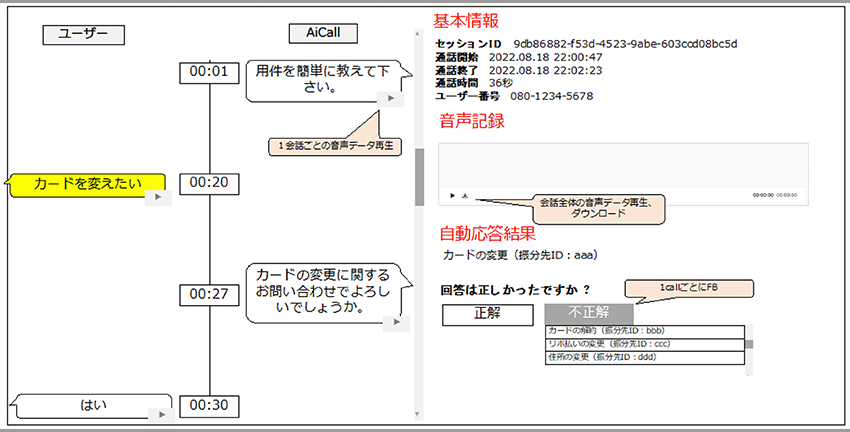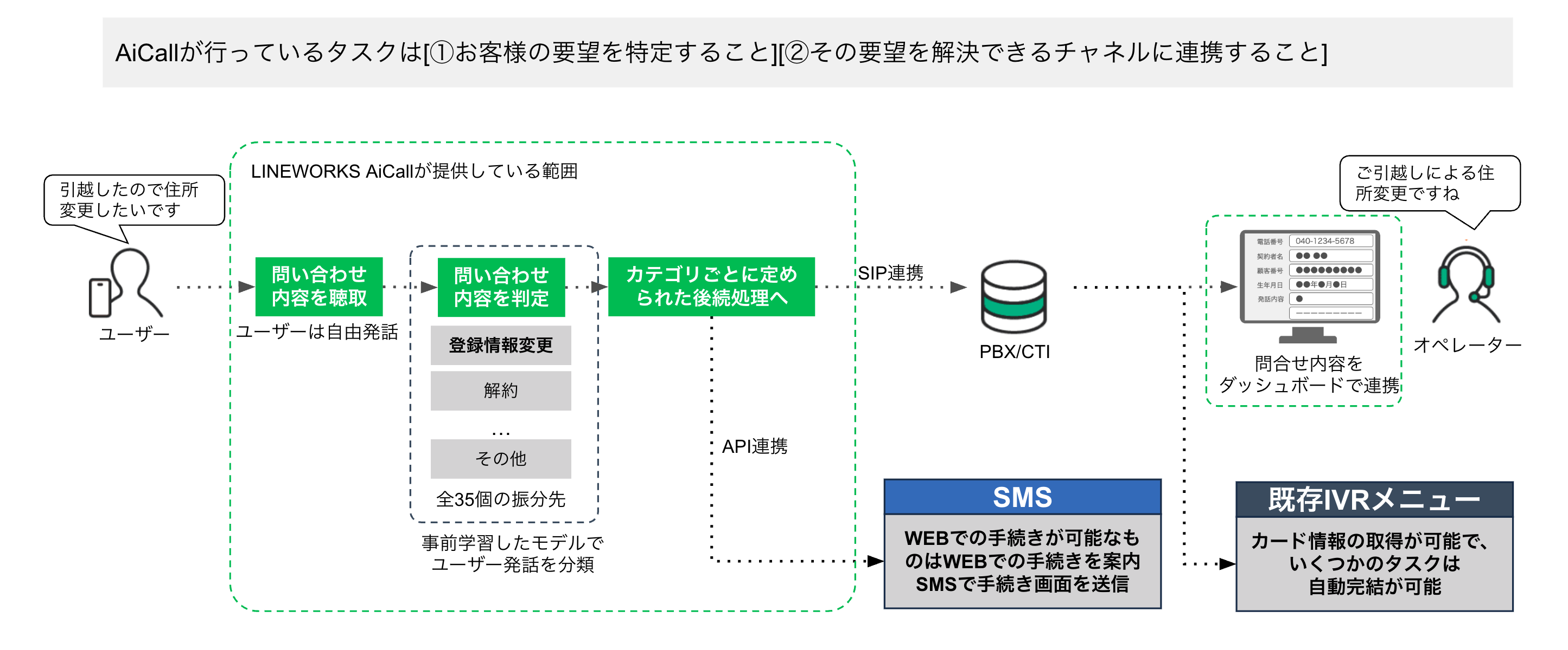 LINE WORKS AiCallが用件を振り分けてからの後続処理は、「Webによる手続きの仕方をご案内するSMS送信」、「IVRによるご案内」、「オペレーターにつないでの対応」に大別されます。通話がオペレーターに転送された場合は、お客さまがLINE WORKS AiCallとの対話で話された内容を分かりやすくテキストで示すダッシュボードも開発して連携させました。