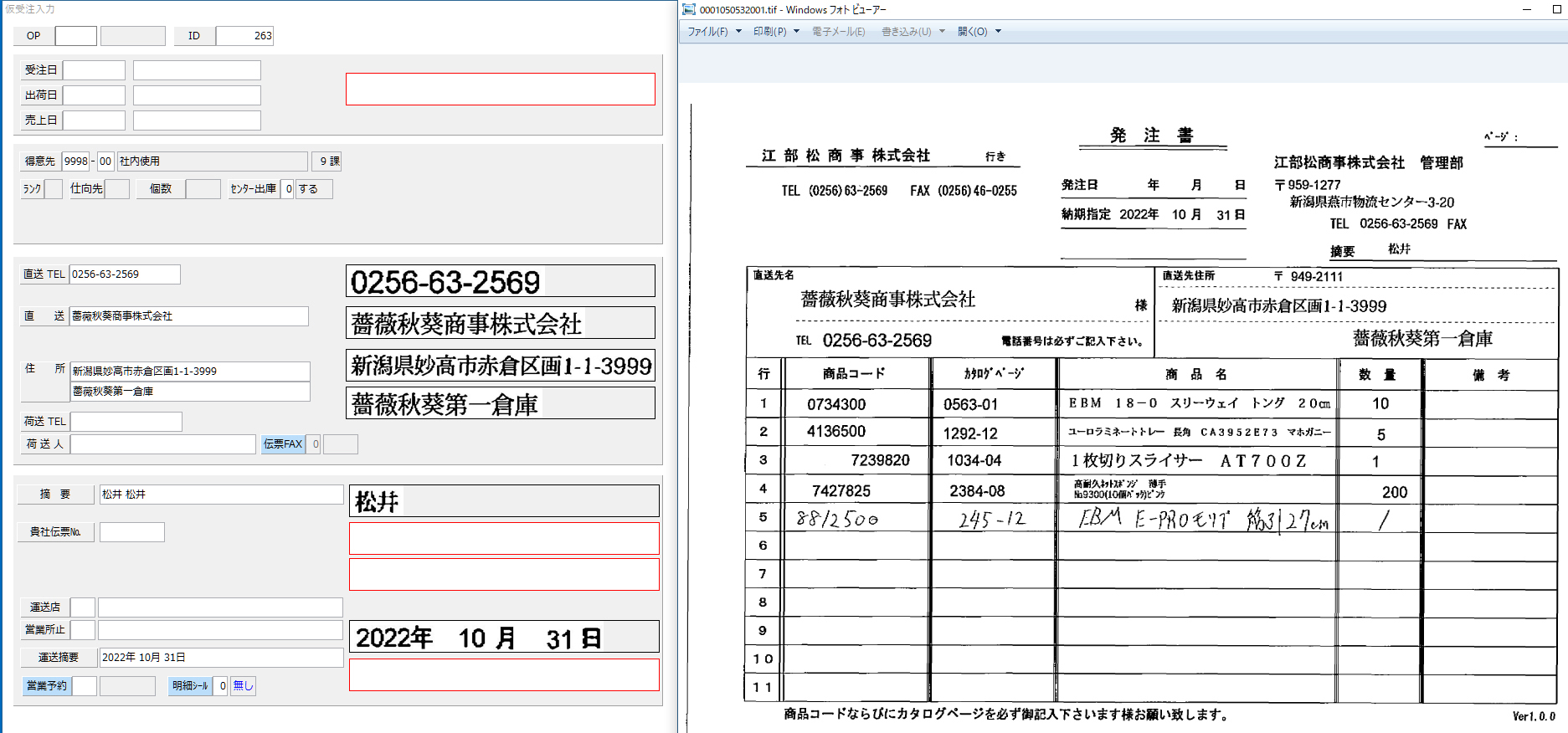 FAXによる受注(右)からLINE WORKS OCRが文字を認識し、受注システム(左)に自動登録される