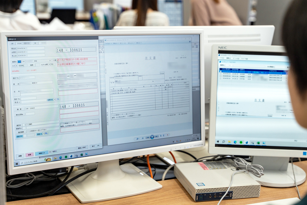 当社は1日平均2,000件以上の注文を受けていますが、卸売業界は全体的にデジタル化が遅れており、約6割にあたる1,200件ほどの発注書がFAXで寄せられます。受信したFAXはCTI(Computer Telephony Integration)で画像データに変換してモニターに表示し、社内で受注入力担当者が、もう1台のモニターを見ながら受注内容を販売管理システムに入力していました。