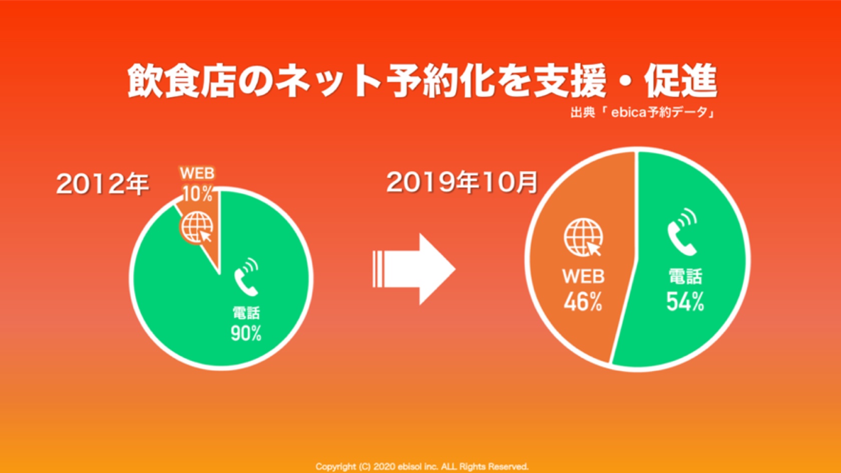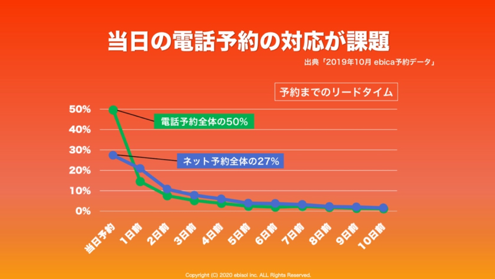 「ebica予約データ分析」からもわかるように、2012年はネット予約が1割ですが、2019年の最近になってもまだネット予約の割合は半数にも満たない状態です。