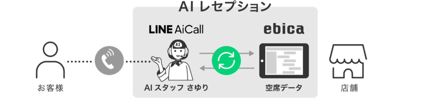 飲食店にかかってくる予約電話に「LINE WORKS AiCall」(AIスタッフ“さゆり”)が応対し、そこで聞き取った内容と飲食店向け予約管理システム「ebica」の空席データをリアルタイムで参照することで、さらに予約登録までを自動化するサービスです。