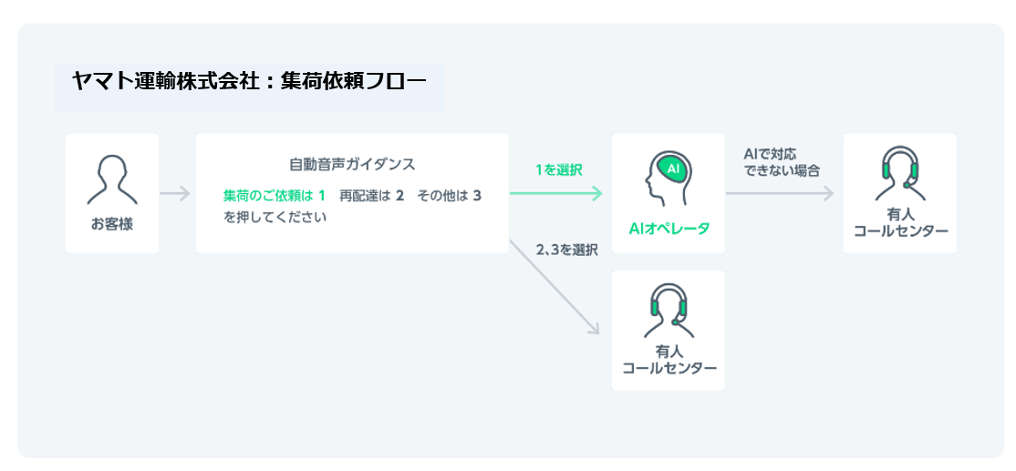 ヤマト運輸株式会社では、お電話による集荷依頼の一次受付として、AIオペレータによる対応を実施しています。2020年11月に法人向けサービスを開始し、2021年1月にエリアの拡大、4月に個人向けサービスを開始しました。