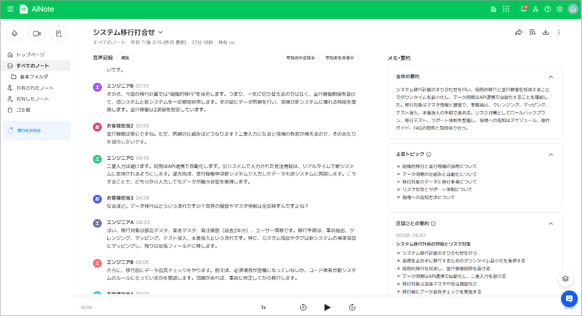 「あの時、誰が何と言ったか」という、言った言わないの確認作業も激減しました。人間の記憶や手書きのメモはどうしても曖昧になりがちですが、AiNoteの話者分離機能とキーワード検索を使えば、すぐに該当箇所を振り返ることができます。私自身は、これまで議事録に残していなかったようなちょっとした打ち合わせでも、手軽に録音してテキスト化する習慣がつき始めており、会議後の振り返りがしやすくなり、情報の取りこぼしがなくなりました。