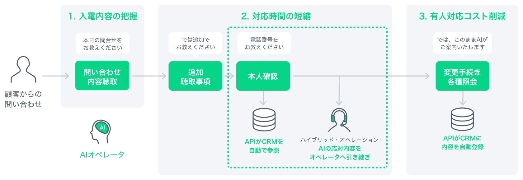 電話での問い合わせでは、「問い合わせ内容の確認」「本人確認」「内容に応じたオペレータへの振り分け」プロセスが基本となりますが、その中でも最初の導入は「本人確認」に決めて、スタートしました。