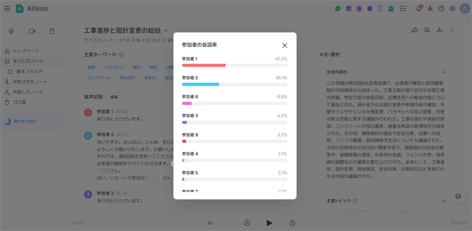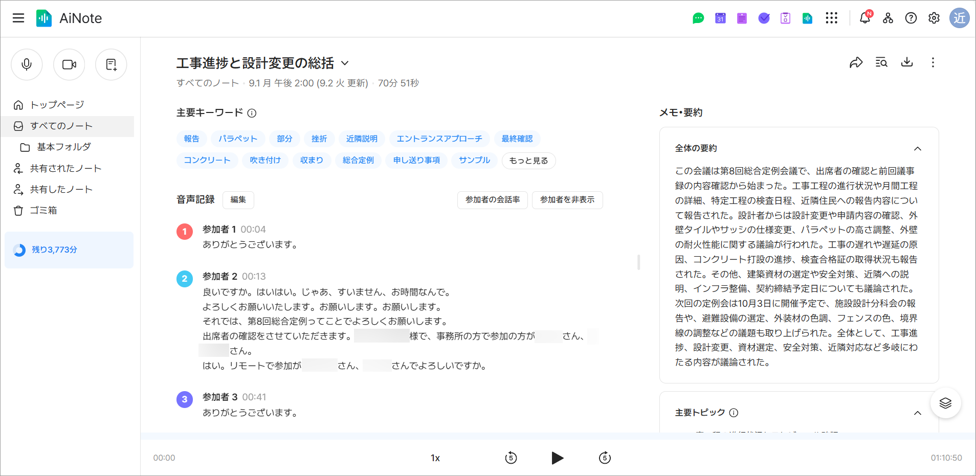 - AIが話者を自動分離して文字起こしを行い、重要な発言内容の要約も自動で生成