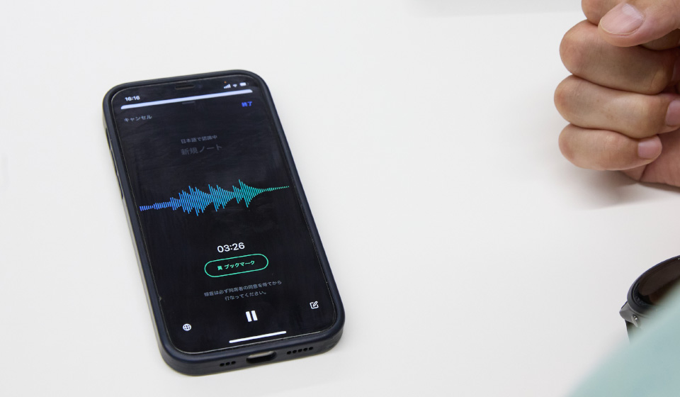 LINE WORKS AiNoteを使ってまず感じたのは、ICレコーダーを用意する必要がなく、スマホ1台で録音から文字起こしまで完結するその手軽さです。会議中に走り書きするメモでは、後から判別できない部分があって困ることがありましたが、LINE WORKS AiNoteなら会話内容が忠実にテキストになるので、そのような心配は不要です。音声認識の変換精度も非常に高く、人が話すときによく発する「えー」や「あー」といった不要な音(フィラー)も自動的にカットされるので読みやすいです。