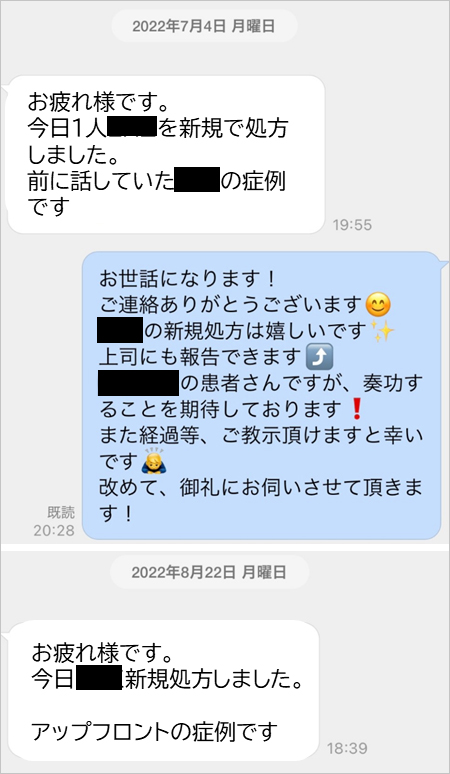 LINEはメールよりも手軽にメッセージを送信できるため、先生方からは当社の医薬品を新たに患者さんに処方した旨の報告をいただくことがあります。この報告により、よりタイムリーな症例フォローアップが可能となっています。
