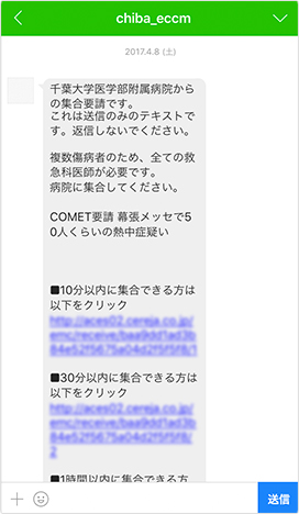 先日、幕張メッセのコンサート会場で具合の悪くなった方が50人ぐらい出たことがありました。私は学会で地方に出張中でしたが、千葉市消防局からCOMET(コメット/Chiba Outreach Medical Emergency Teamの略。緊急医療チーム)にコール(呼び出し)がかかったのです。今までは電話がかかってきて、状況を聞いてからCOMETを出動させるかどうか判断していたので、現状把握や判断に時間がかかっていました。それが、今回はLINE WORKSで情報がチャットで飛んできて、状況が刻々と共有されていく。これは大変なことだから出動してください、と応え、すぐに出動することができました。世界中どこにいても指示を出すことが可能になったうえ、現場と病院内のやり取りをLINE WORKSでずっと見ていたので、すべての様子が手に取るように分かり、非常に感心しました。