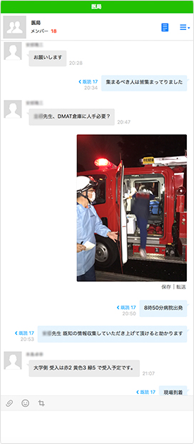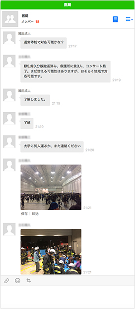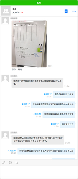 ちょうど先日、幕張メッセのコンサート会場で多くの傷病者が発生した際に、千葉市消防局から出動依頼があり、医師集合要請システムが発動しました。LINE WORKSのBot API経由で要請のメッセージが送信されると、1分くらいで皆から応答があり、すぐに出動するメンバーが病院に集合できました。僕も出動したのですが、救急車で現地に向かう間も、無線で入ってくる千葉市消防局からの情報をLINE WORKSで共有していました。現場到着後,メンバーは、写真なども含め必要な現地の情報をリアルタイムに現場外のメンバーと共有しました。刻々と変わる状況を細かく共有することで、その場にいないメンバーや在宅のスタッフも状況を把握し、どんな対応を求められているのか、行く必要があるかを判断できるようになりました。