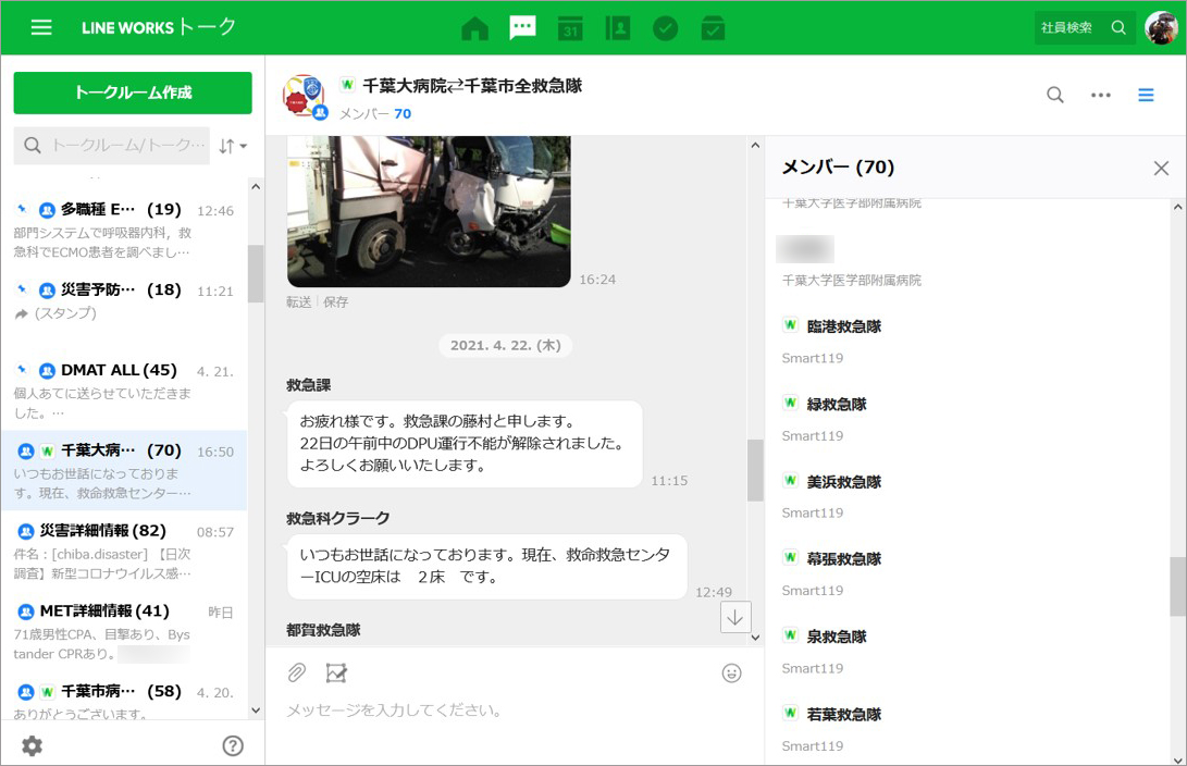 「以前から救急医療情報サービスSmart119をBotで連携し、システムから発信される救急受入要請と医師の集合要請をLINE WORKSへ通知し、いち早く地域の救急情報と対応できる医師の状況の把握ができる仕組みは整っていました。