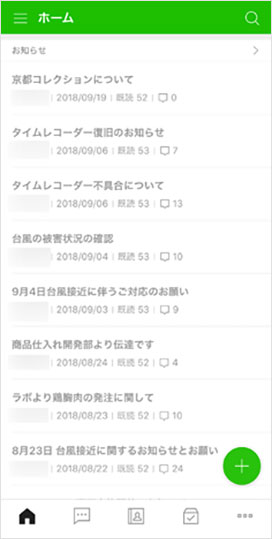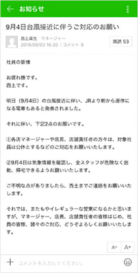 ホーム機能は、緊急時の情報伝達にも役立っています。2018年9月に大型台風が接近したときは、社員が安全に出勤・帰宅できるよう、営業時間短縮や臨時休業に関する店舗ごとの判断を店長に促す通達を前日にホームで行いました。以前なら、本部が各店長にそれぞれ電話連絡をしなければなりませんでしたが、その手間を省くことができ、公休日の店長に連絡がつかないといったこともなくなり満足しています。
