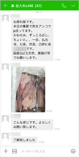 仕入れ担当マネージャーが朝市場で調達した食材の写真を共有し、その調理法に関する指示出しを迅速にできるようになりました。店舗側としても到着する前に食材の状態が分かるので、どういった料理にするかなどを事前に考えることができます。