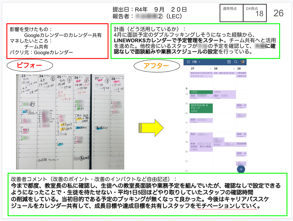 有給消化日数も6日から10日に増加し、従業員に『余裕』が生まれたことから「つきいち業務改善」という新たな取り組みを始めました。投稿された業務改善事例の中から、各職員が特に優れていると思うものに投票し、得票数の多い事例を表彰しています。採用した事例のひとつに、手書きのスケジュール帳で業務や面談の調整をしていたのをLINE WORKSのグループトークの共有カレンダーに切り替え、調整の省力化とミスの軽減を実現しました。