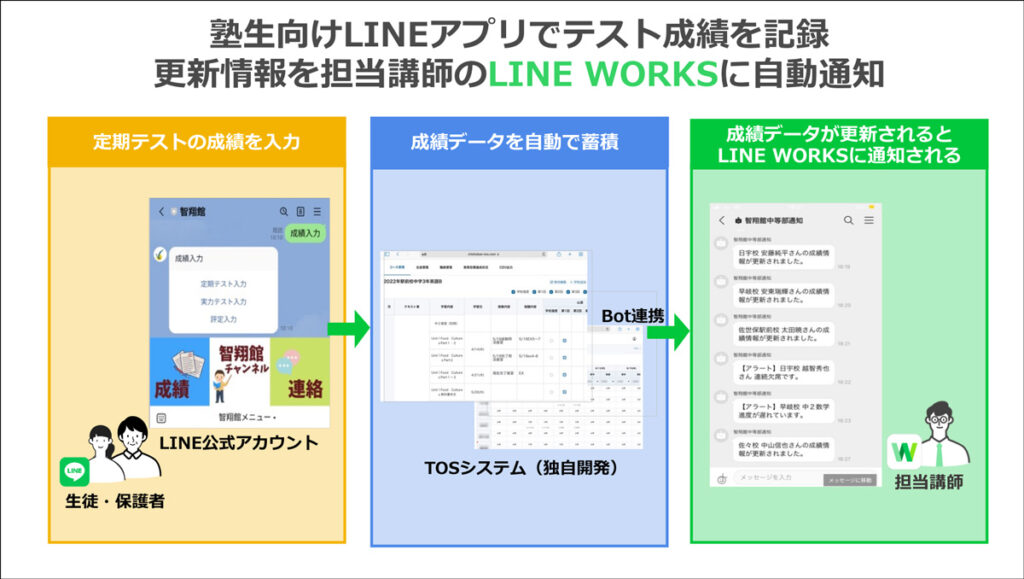 また、中等部では学校の定期テストの結果を把握しており、以前は講師が生徒から成績を聞き出して紙に記録していました。また生徒は毎授業で学習について振り返りを紙に書いていましたが、現在はそれぞれの生徒がLINE公式アカウントに入力してもらい、自動的に管理システムに蓄積される仕組みを構築しています。データが更新されると、担当講師のLINE WORKSにBotで通知されます。生徒はわざわざ校舎にくることなく成績の報告や振り返りをすることができ、講師はいつどこにいても生徒のデータを確認できるようになりました。