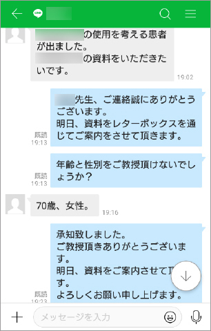 直接お会いした際や、オンライン面会の最後にQRコードを表示し、それを先生のLINEで読み込んでご登録いただいています。ご登録いただいた後は即座に、「今後のアポはLINEでよろしいでしょうか」「副作用情報をLINEでお聞きしてもよろしいでしょうか」など、質問を投げかけるようにしています。特に患者さんに関する情報は、個人情報との兼ね合いもあり、対面でしか伝えられないというケースも考えられるので、必ずお聞きするようにしています。
