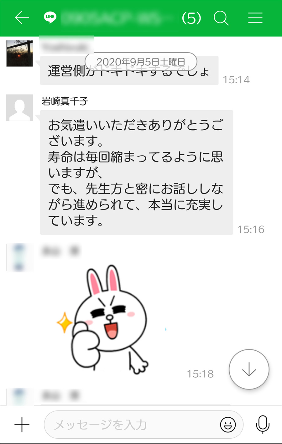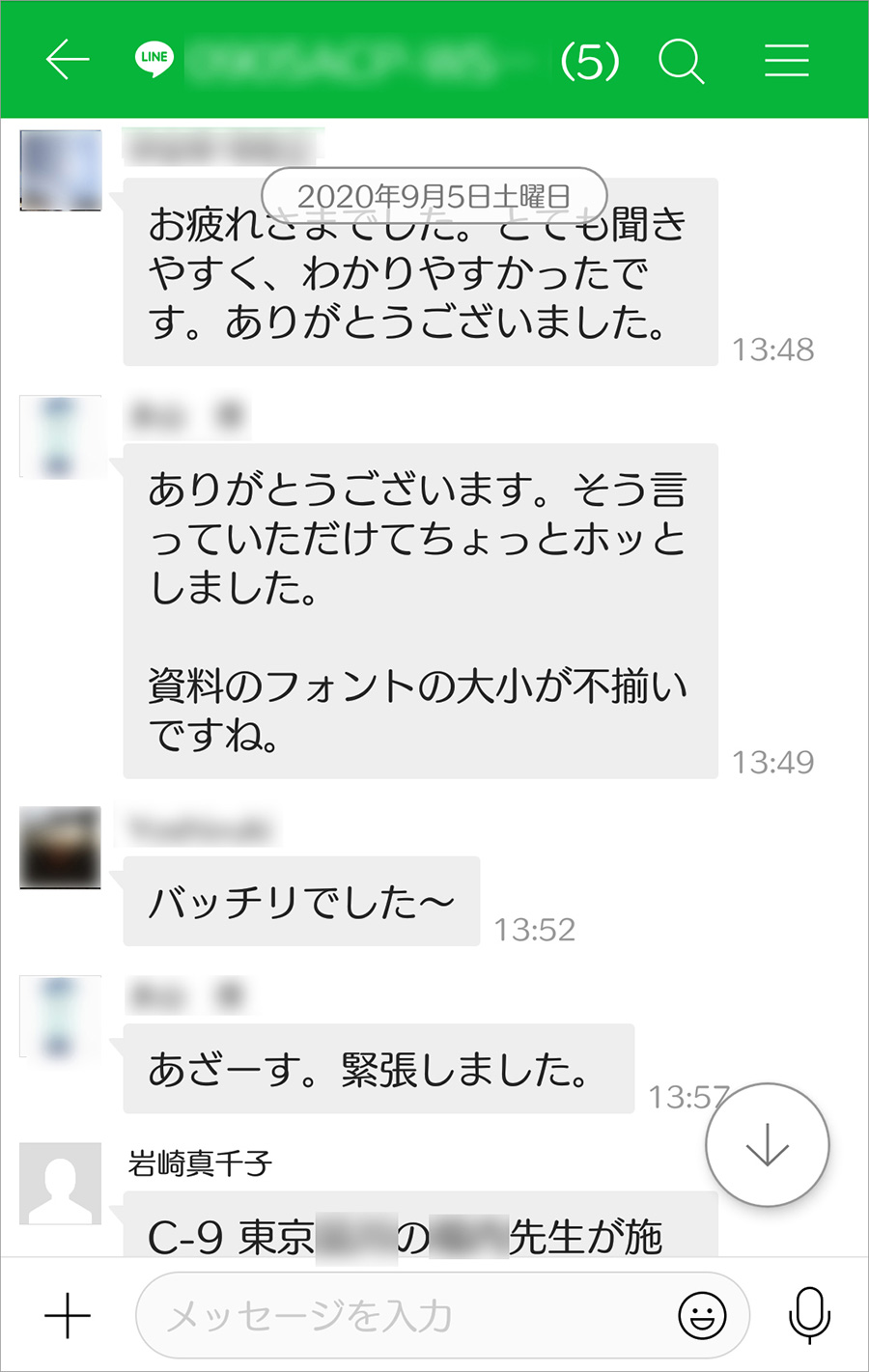 講演者へのリアルタイムなフォローは重要なポイントです。オンラインワークショップは参加者の反応が見えにくいという問題がありますが、「よかったですよ」などのメッセージをトークで随時送信することは講演者の先生に「心の支えになる」と喜ばれています。長時間の講演でも休憩時間にそういったやりとりができることは、後半の講演のモチベーション維持にもつながります。急遽、欠席者が出たときなど、ワークショップのグループの編成替えも随時LINE WORKSでお伝えできます。スタンプを活用する先生も多く、私自身も先生との距離が一気に近くなり、以前より先生への依頼がしやすくなりました。