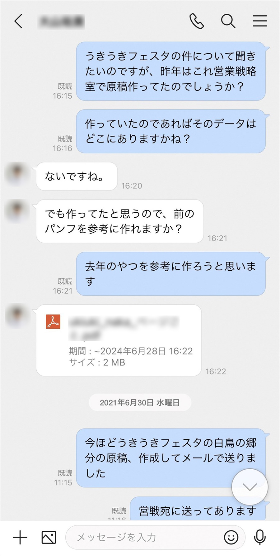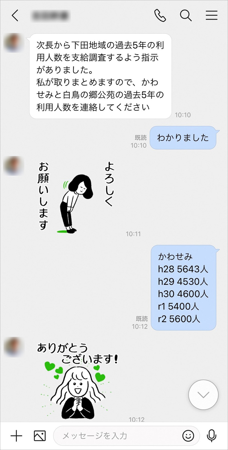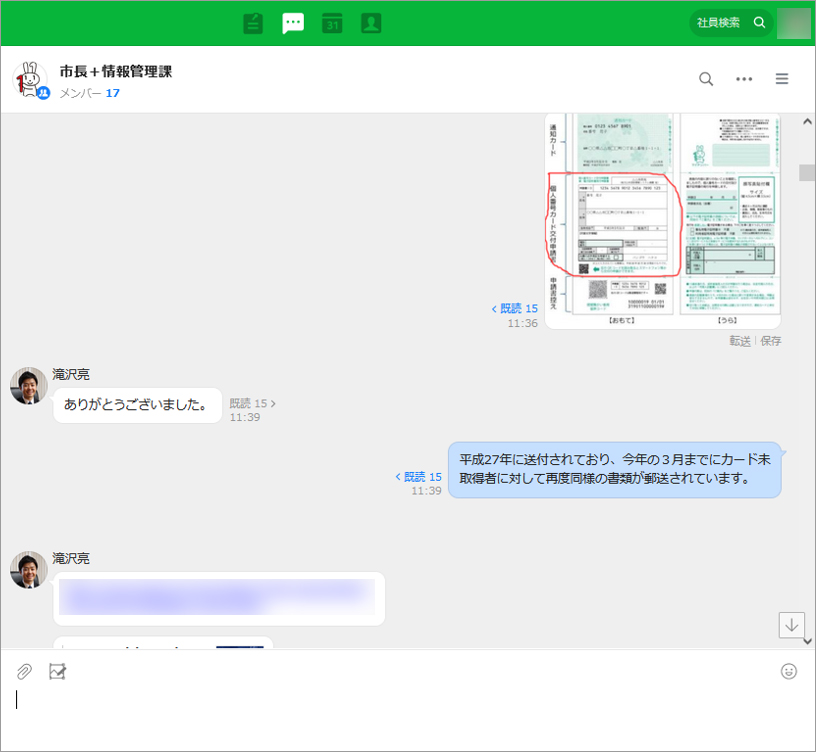 これまで職員どうしの主な連絡手段は電話でしたが、行き違いになることが多く、伝達事項を相手に伝えるまでに、手間と時間がかかっていました。また、庁内には紙の資料をやり取りするための「庁内便」がありますが、情報が伝わるまでに数日かかっていました。LINE WORKSが導入されたことで、ほかの庁舎にいる職員や他部署の職員と速やかにやりとりできるようになり、大きなメリットを感じています。