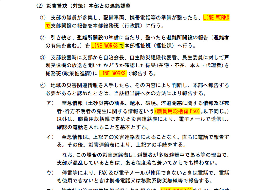 また、防災対応の目的で災害時に避難所に設置される公用のスマホでもLINE WORKSを使用できるようにしています。