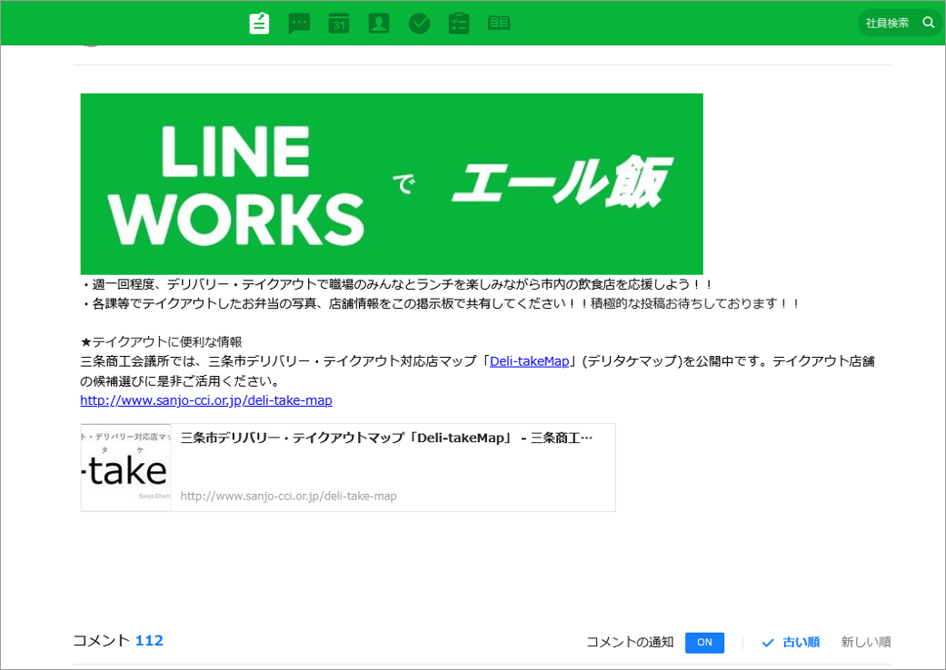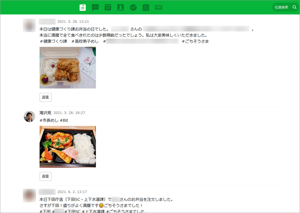 課ごとに掲示板のカテゴリを作り、全庁に向けたお知らせ等の発信に活用しています。営業戦略室では、「エール飯」という取り組みを掲示板で公開しています。コロナ禍で売上が落ち込んでいる地域の飲食店を応援するものとして、職員がデリバリーで注文したお弁当の写真を撮影して掲示板に投稿するというものです。市長自らが、お弁当の写真を投稿することもあります。庁内職員に向けたお店の宣伝につながり、陰ながら地域の飲食店を応援しています。