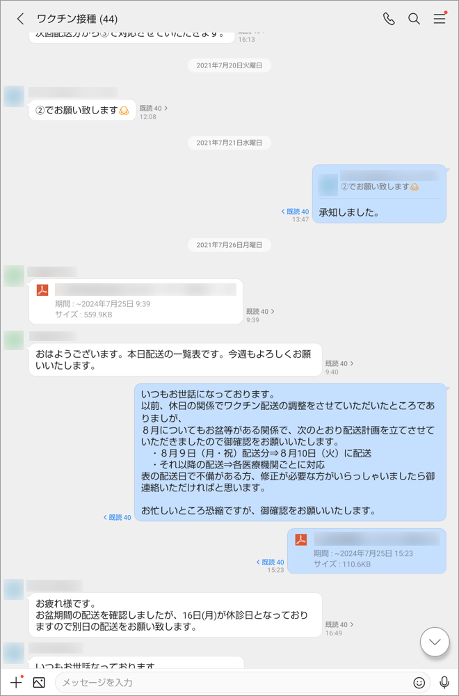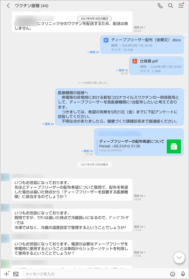 2021年5月に三条市のワクチン接種対策本部で医療機関向けの説明会を開き、予めLINE WORKSのアカウントを付与したタブレットを配布しました。ワクチン接種対策本部は3名の担当職員がアカウントを持っており、ワクチンの配送スケジュールの連絡をしたり、医療機関からの質問に回答したりする取り組みを行っています。