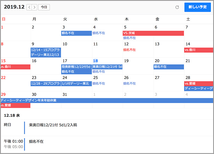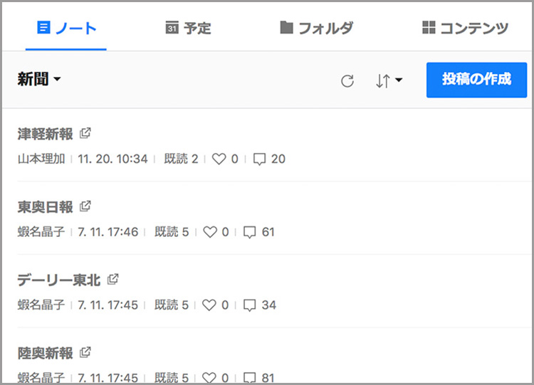 試合ごとのポスターやパンフレット等、青森ワッツの制作物を掲載する媒体ごとにノートを作っています。ノートのコメントを通して青森ワッツさんから制作物のデザインへのフィードバックや修正依頼などをいただくようにしています。試合日程に合わせて制作するものも多く進捗管理が複雑なので、共有カレンダーも活用して入稿日やお互いのスケジュールを把握し合い、厳密な管理体制を整えました。