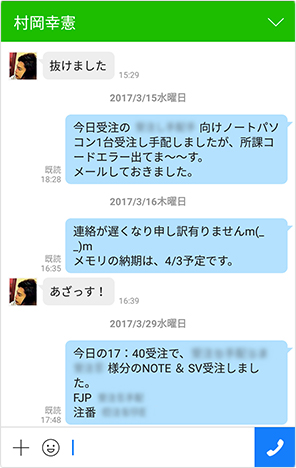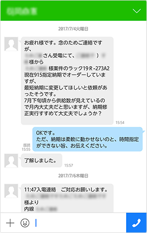 営業の支援を行っていますので、見積りや発注・納品のやり取りをトークで行うことが多いですね。以前はメールや電話でなかなか連絡がつかず待ち時間が発生していましたが、余計な待ち時間がなくなって、仕事の優先順位をつけやすくなりました。LINE WORKS導入で営業との連携がしやすくなったと感じます。