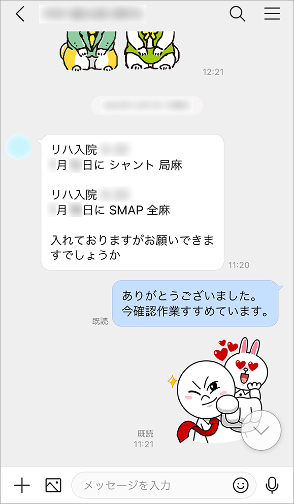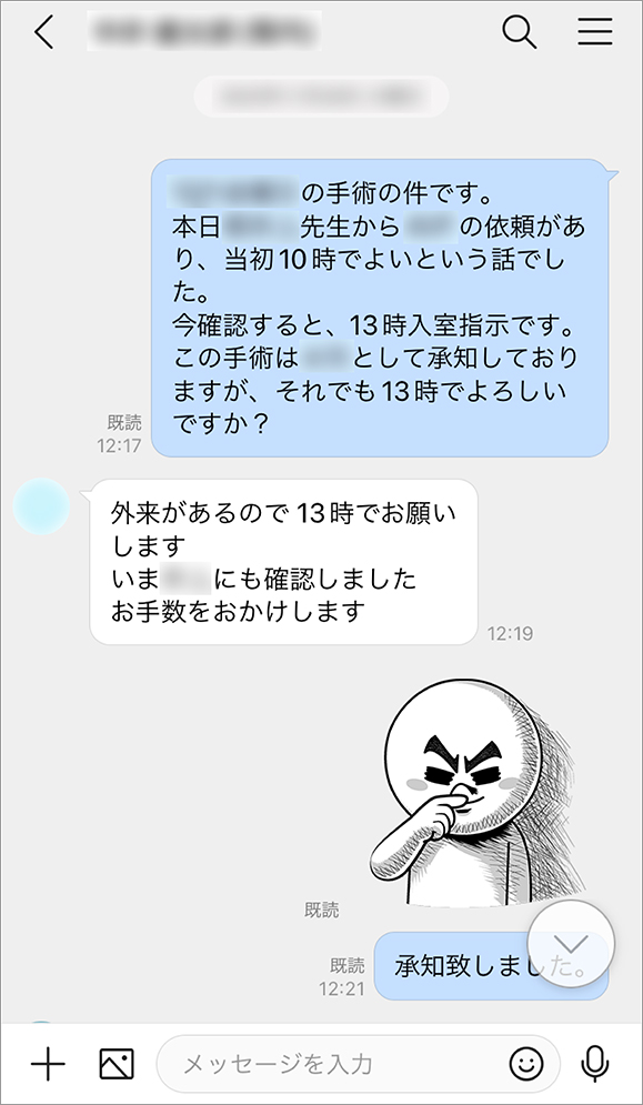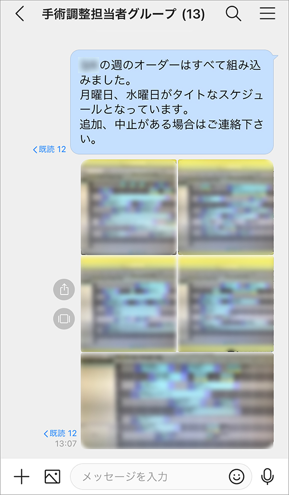 手術のスケジュールは、専用のグループをつくって関係者全員に共有しています。スケジュール表の写真をトークルームで送れば速やかに確認してもらえるので、手術日直前まで確定しなかったスケジュールが、今では手術日の前の週には確定するようになりました