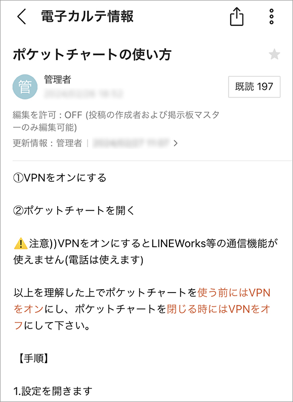 2024年1月に電子カルテシステムをリプレースした際、医師や看護師から使い方などに関する多くの問い合わせが情報システム課に寄せられてきました。同じような内容の問い合わせが多かったことから、LINE WORKSで「電子カルテ情報」という掲示板を作成してFAQを掲載して周知することで、一般的な疑問は掲示板を確認して解決してもらえるようになり、対応業務の負担が軽減しました