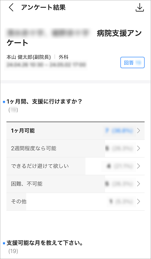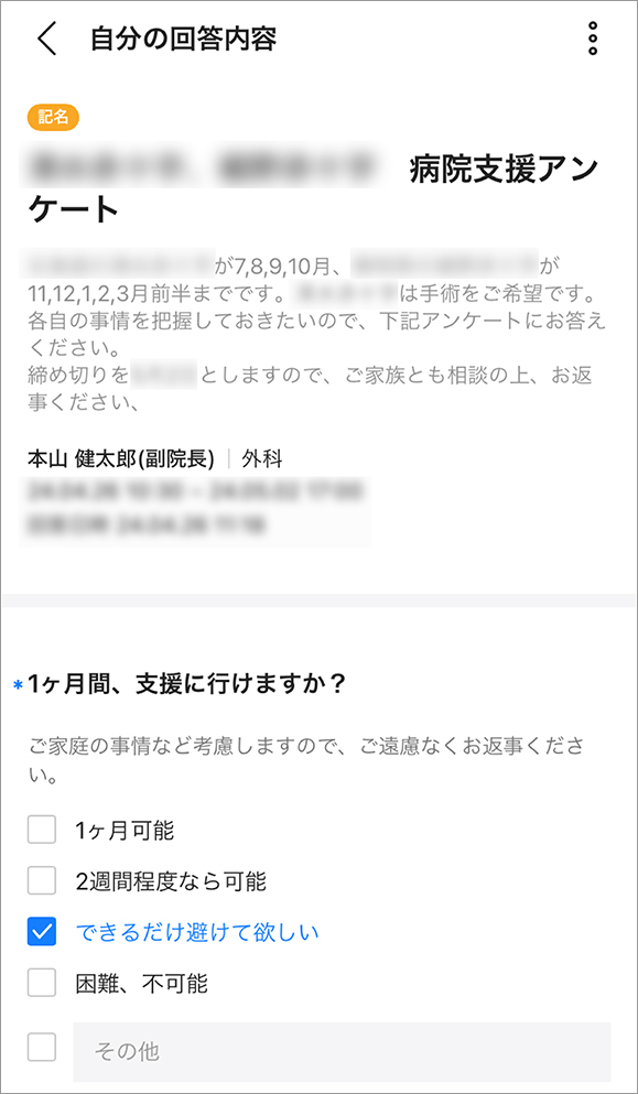 他にも、アンケート機能を利用して他の病院支援の出張に協力してくれる医師の募集や、職員の意見収集を実施しました。多数の職員に対面や電話で一人ひとりに意見を確認するよりもスムーズで便利なので、今後さらに積極的に活用していきたいと考えています。