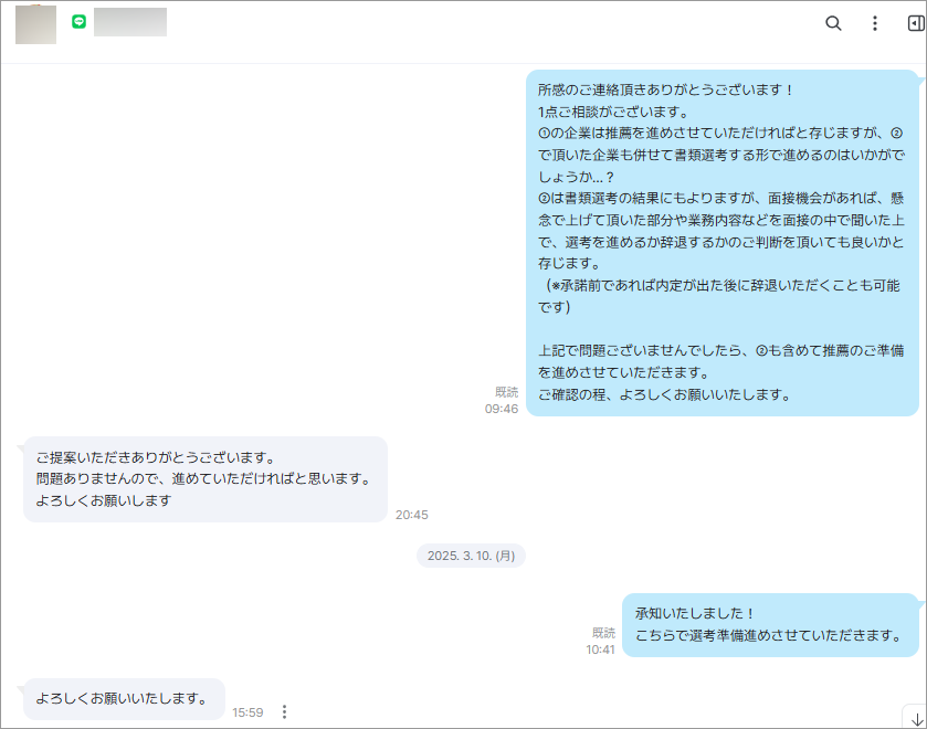 転職が決定し、いったんエージェントサービスの提供が終了した後も、友だち登録は解除せずにそのままにしています。これは、求職者の方が将来的なキャリアアップなどで、当社に再び気軽に相談していただくためです。