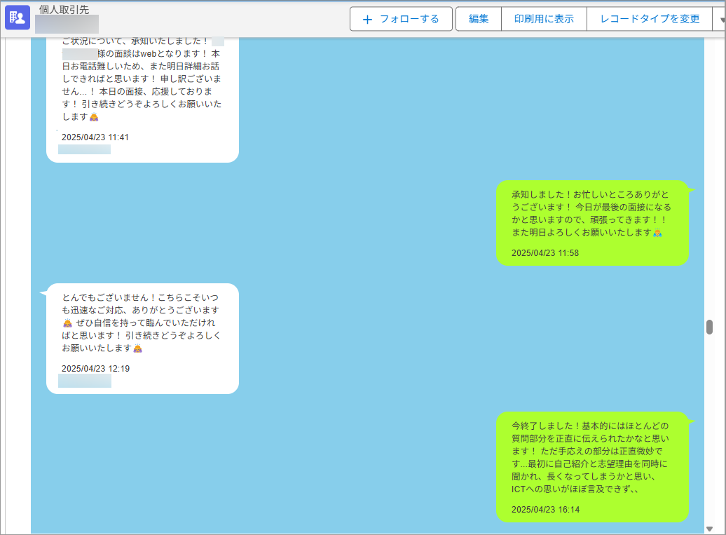 採用面接を受けた求職者から「今、面接が終わりました」と報告があった際には、「少しお話できますか?」と電話をかけ、手応えを尋ねることも容易になりました。このような気軽にやり取りができるコミュニケーションを通じて、各CAは求職者に対してよりきめ細かなサポートを提供できるようになったと感じています。