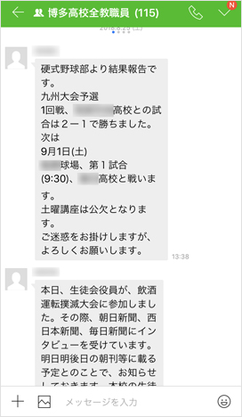 私は時間割係を担当しており、出張や年休などで教員が授業をできない際の調整をしています。これまではサポートしてもらいたい教員と連絡を取るのに時間を要することがありましたが、LINE WORKSなら「何曜日の何時間目に授業をして欲しい」といった依頼がスムーズにできるようになりました。また特定のグループだけではなく、全教職員に情報を発信するのも容易で、部活の試合日程やその結果、勉強合宿など課外活動の様子を瞬時に報告できます。