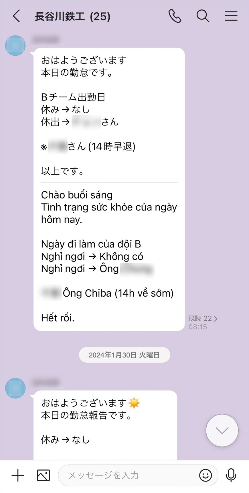 当社にはベトナム人の技能実習生・インターン生が計4名勤務しています。彼らとのコミュニケーションを円滑にするために翻訳機能を活用しています。日本語で送ったトークが即座にベトナム語に翻訳されるので、相互理解が促進し、スムーズな業務遂行を実現しています。