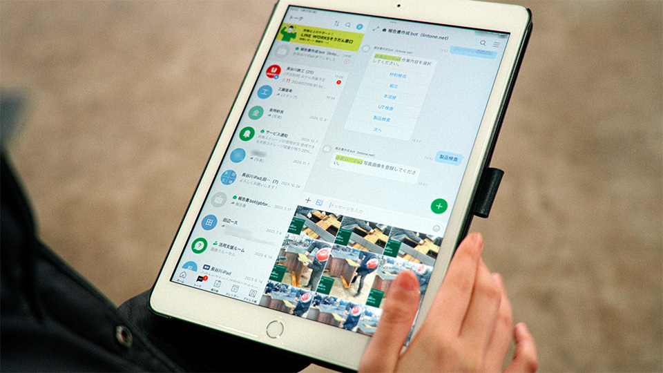 まず、工場でLINE WORKSのアプリが入ったiPadで製造工程の写真を撮影し、そのままLINE WORKSのチャットボットの質問に回答しながら撮影した写真を選択して送信します。その回答情報がkintoneに連携され、kintoneに登録された情報が自動的に検査報告書として出力されます。