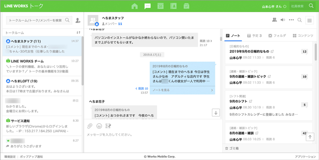 使い方を探る中で、LINE WORKS の場合はLINEのように、やりとりをしたいメンバーごとにトークグループを作り、その中でトピックごとのやりとりは「ノート」を使い、スケジュール共有は「グループカレンダー」機能を使えばいいと気づいたんです。