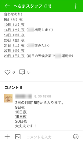 「シフト関連」は、勤務シフトが埋まらなかった日時の調整に活用。コメントで『この日なら入れます』『じゃあ、私はこの日入ります』と全員で自発的に協力し合えるため、1人1人と調整する必要がなく、効率的です。