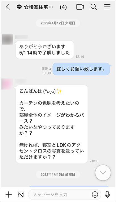 お客様側でも、平日の日中はご家族間でタイムリーに会話ができません。私からメッセージを受けたご主人、または奥様がご家族にその内容を伝える手間を省き、ご帰宅時にお互いが内容を把握した状態から会話が始められるよう、ご夫婦の場合はご主人と奥様、2世帯住宅ならご両親などもトークルームに参加されることも勧めるようにしています。ご家族の皆様にトークルームに参加いただくことで、タイムリーに情報を共有いただいています。