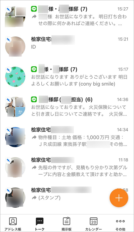頻繁に連絡を取る進行中の案件のトークルームは、ピン留め機能で一覧の上部に固定表示してすぐに開けるようにしています。お引き渡し後はピン留めこそ外しますが、何かご相談があればいつでも対応できるよう、トークルームは削除せずそのままにしています。
