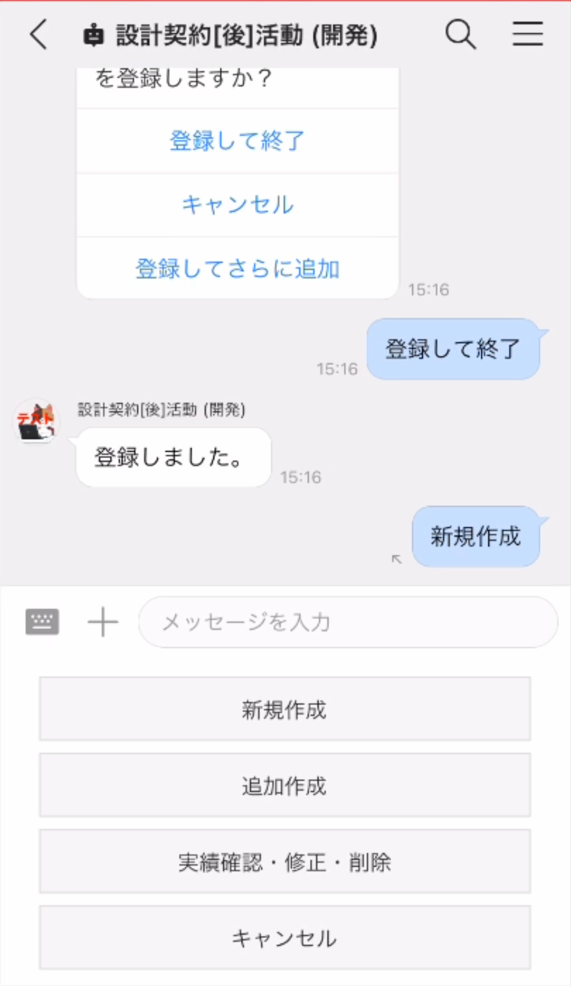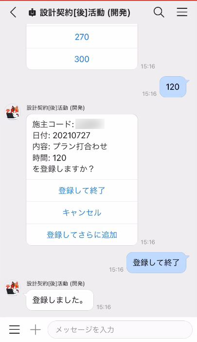 LINE WORKSのトーク画面から会話形式・選択型で日々の活動を入力し、データベースに自動登録させる仕組みです。スマホやタブレットから設計者がトーク画面でBotをクリックすると、「どの仕事を登録しますか?」とメッセージが表示され、リストアップされた各自の担当案件から登録する案件を選択します。あとはBotの質問に答える形で日付や活動内容、活動時間などを順番に入力すれば登録作業が完了します。