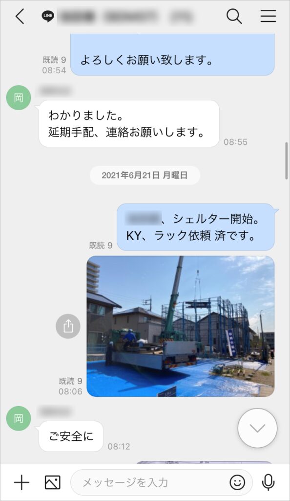 グループトークで現場の進捗状況や問題点を一瞬で共有できるので、とても役立っています。例えば、施工店様がスマホで問題個所の写真を撮影し、「ここはどうしましょうか?」とグループトークで相談します。すると、その情報が関係者に即座に伝わり、最善の解決策を導き出せるので、品質や作業効率が格段にアップします。事務所に戻ってから連絡する手間が省けるので便利になったと好評です。