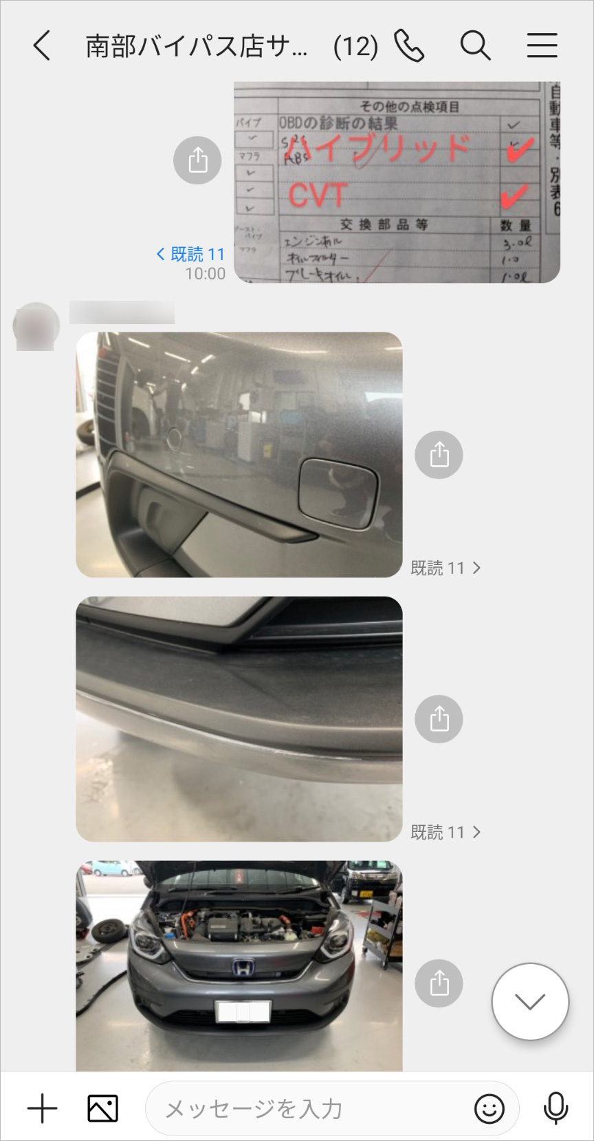 お客様が保険を使って修理される場合は、車両の状況を示す写真を保険会社に提出する必要があります。以前は、整備担当者がデジカメやスマホで撮った写真を会社のPCに取り込んで保存して保険会社とやり取りする担当者にメールに添付して送信していましたが、今は整備担当者がスマホで撮影した写真をそのままトークで担当者に送られるようになり、業務のスピードアップにつながっています。