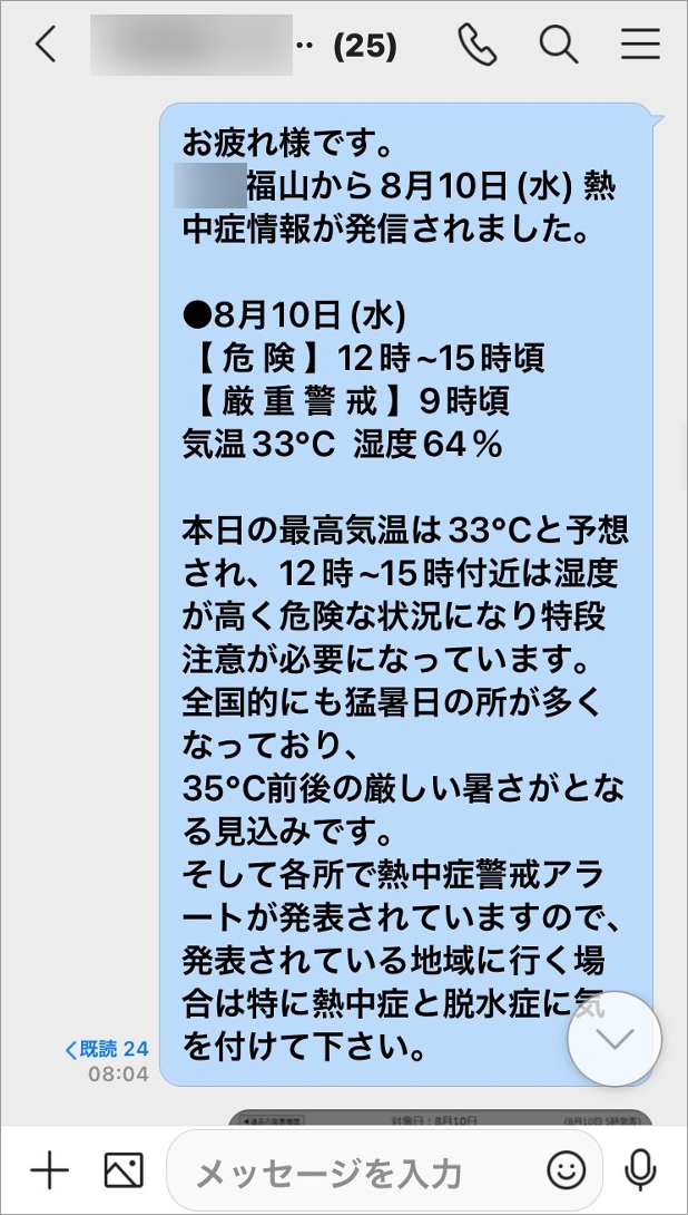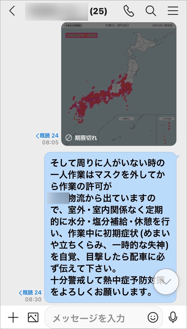 グループトークルームを活用することで、乗務員全体への情報周知も簡単にできるようになりました。年間をとおして荷積みなどの作業もする乗務員は、夏場は熱中症になるリスクがあるので、営業所は毎朝その日の予想最高気温をグループに発信し、台風が接近しているときなどは、気象情報にアクセスするURLリンクも送って注意を促しています。