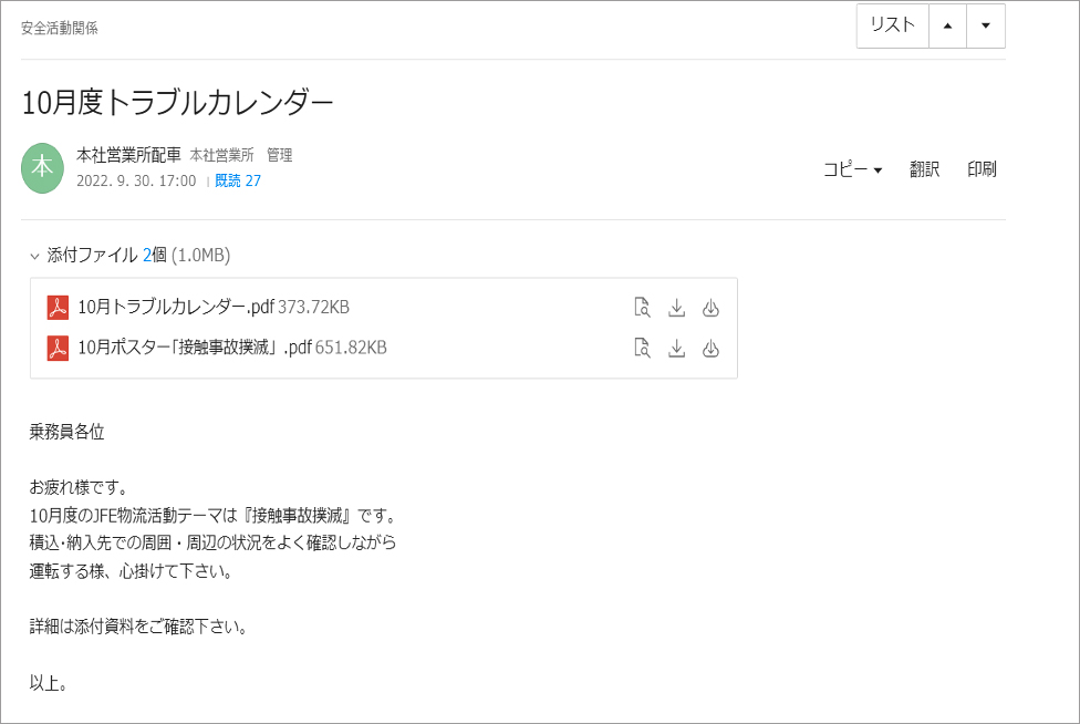 これまでホワイトボードへの掲示や回覧していた会社からの通達・通知は、既読確認ができる掲示板機能で発信するようになりました。前述したJFEグループの拠点の構内ルール変更なども、掲示板を使えば全乗務員に一斉に知らせられます。運送会社への安全喚起のため、過去にあった重大な労災に関する資料が提供されたときも掲示板にアップ。既読にならない乗務員には営業所の管理者が閲覧を促し安全意識を高めています。