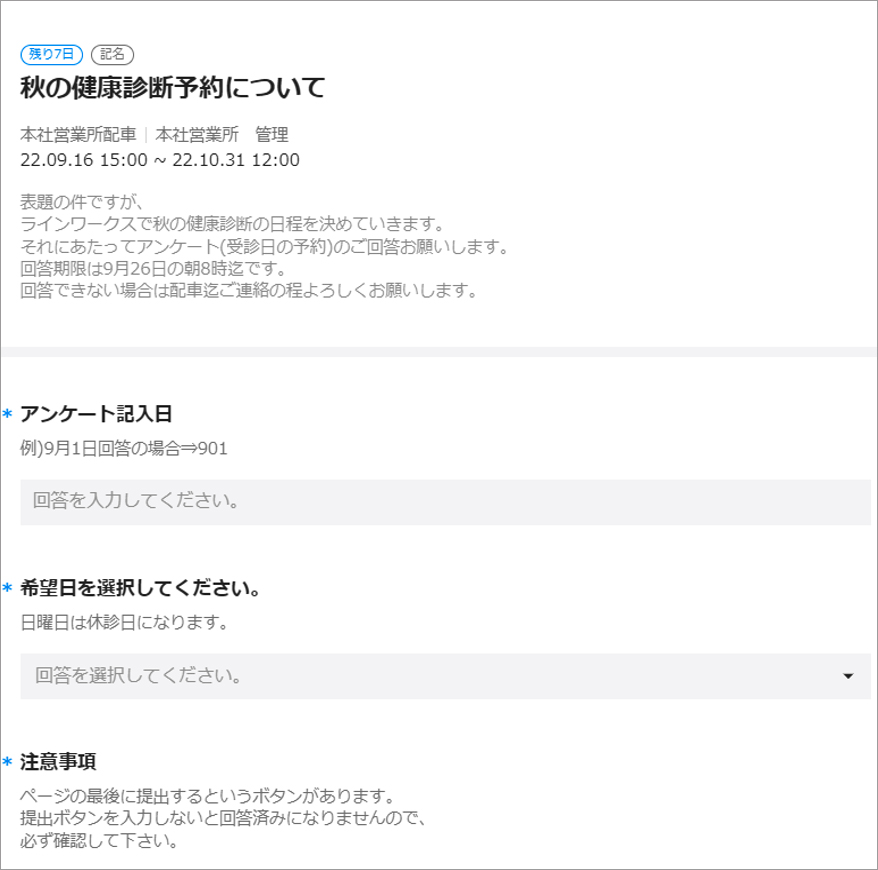 健康診断の胃カメラ検査の希望日を確認するのにアンケート機能を利用しました。各営業所の担当者が乗務員一人ひとりに個別に確かめる必要がなく業務負担の軽減につながったので、今後は社員の意向を確かめたり意見を収集したりするのに積極的に活用していきたいと思っています。